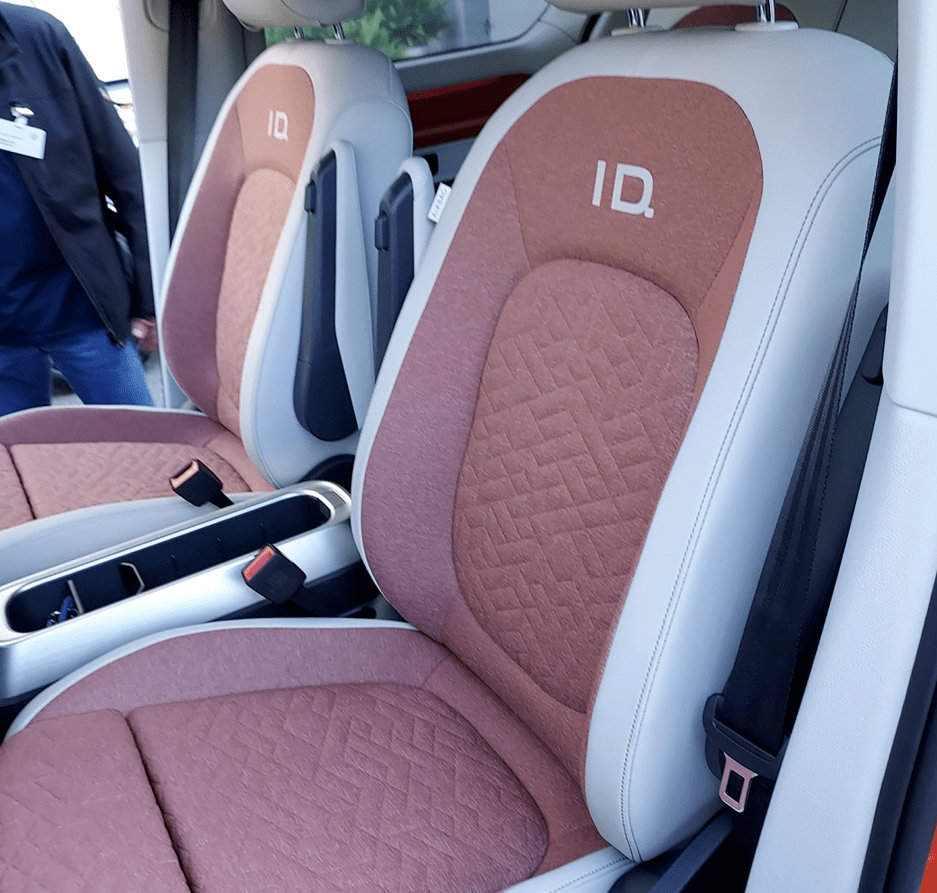 这台路试车的座椅看起来很独特,除了ID.家族刺绣字样外,似乎中央红色区域采用了可回收材质面料,细看有一些亚麻材质的质感。座椅整体显得平坦宽阔,还带有腿部支撑,舒适度应该很不错。