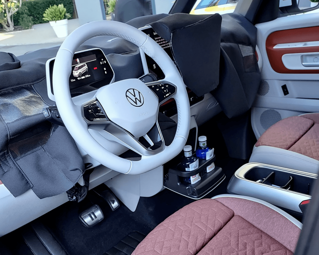 首先可以看到,新车采用了十分罕见的白色内饰,尤其是白色方向盘非常罕见。但这样的配色很可能不会出现在量产车上。相比下图的概念车内饰,高度夸张的中央扶手被降低到了正常高度,副驾驶大屏也被安放在了中控台中央。方向盘前方还有一块小仪表,造型与ID.系列车型相似。因为电动车无需布局排气和传动系统,所以中央扶手区域采用了完全打通的设计,腿部横向空间将得到彻底释放,这样的设计很“MPV”。