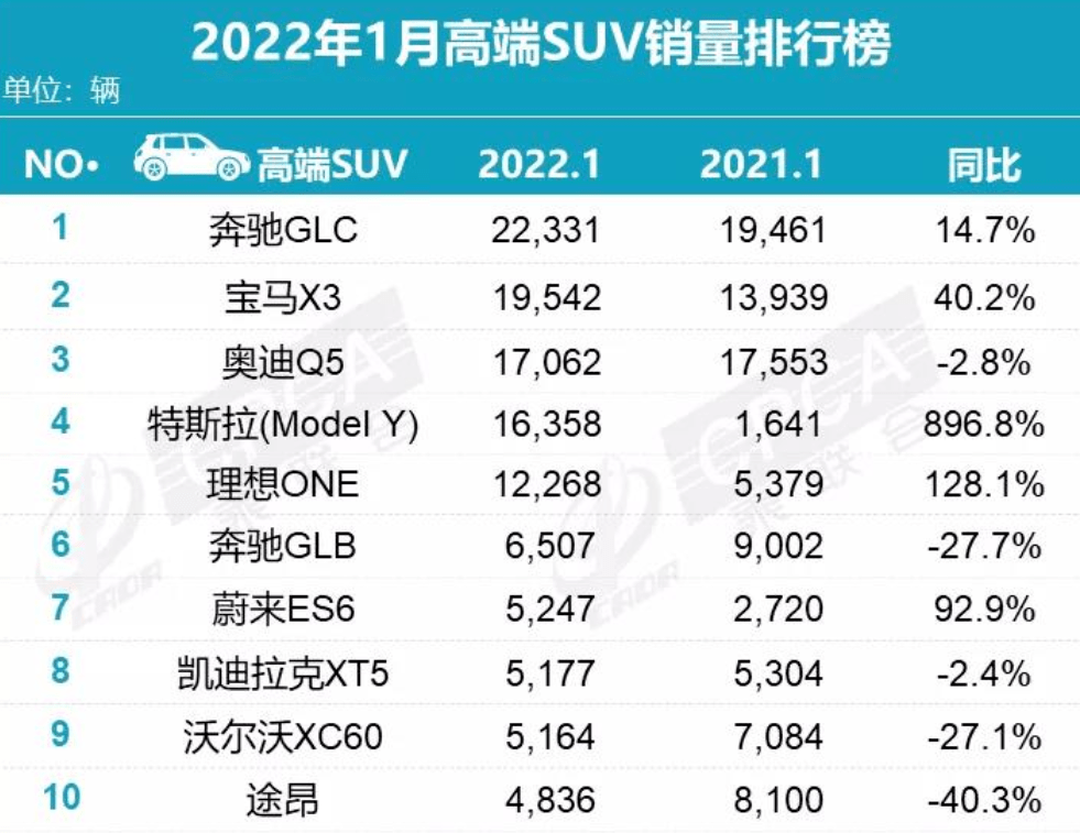 奔驰GLC凭借22331辆的成绩,夺得高端SUV销量冠军,这应该主要得益于奔驰C级让出的产能,但14.7%的增速明显不如宝马X3,2月份很可能被宝马X3反超。理想ONE则已经稳定在万辆以上的销量,128.1%的同比增长非常亮眼,考虑到其中大型6座SUV,还能上绿牌的精准定位是其核心竞争力,这一点短时间内还没有其他产品能对其构成威胁,它的增长也将持续一段时间。