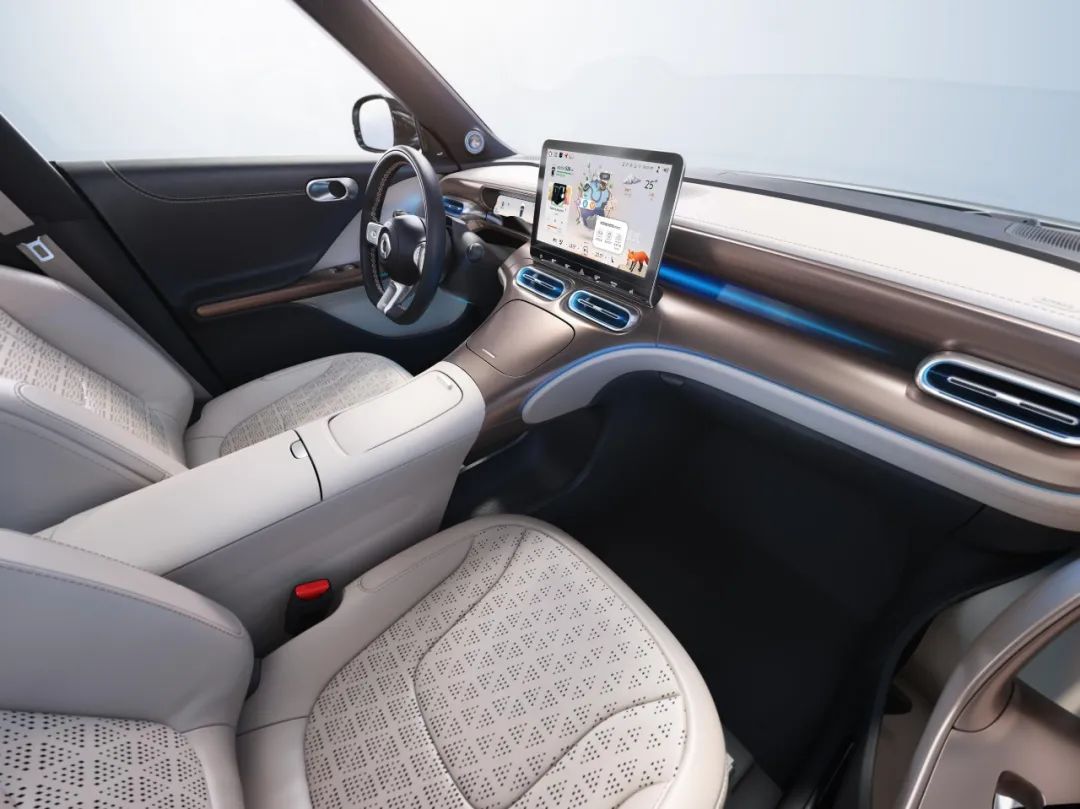 既然是奔驰亲自操刀的内饰自然不用我们担心,作为一款纯电动车型,smart精灵#1的内饰设计采用全新设计语言,与此前燃油车型大相径庭。具体来看,车内采用土豪金配色,中控台的布局更倾向于驾驶员的方向,其中9.2英寸的液晶仪表和12.8英寸的悬浮式中控屏,将整车的科技氛围拉向新的维度,此外,新车中控区还取消了大量的实体按键,进一步彰显其新能源车型的前卫。车内整体用料、风格向豪华、科技方向靠拢,其中64色车内氛围灯可以说是得到了奔驰的真传。