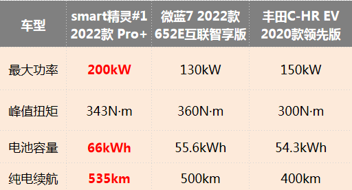 此次smart精灵#1的动力系统由吉利主导研发,在数据表现上十分给力。新车将采用后置永磁同步电机驱动,最大功率200kW,最大扭矩343N·m,官方公布的零百加速时间为6.7s,两款车型纯电续航里程分别为535km和560km,不管是微蓝130kW的最大功率,500km的纯电续航,还是丰田C-HR EV150kW的最大功率,400km的纯电续航都很难与之匹敌。