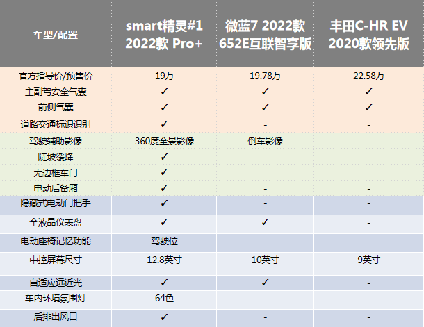 除此以外,足够丰富的驾驶辅助系统以及人性化配置也足以撑得起smart精灵#1,19万元起的预售价。其中,360度全景影像、陡坡缓降、无边框车门、电动后备厢、驾驶位电动座椅记忆、后排出风口、隐藏式电动门把手、道路交通标识识别等功能都是微蓝7和丰田C-HR EV入门车型所不具备的,此次smart精灵#1即使是入门版车型科技配置也堪称琳琅满目,称得上领先同级,更值得购买。