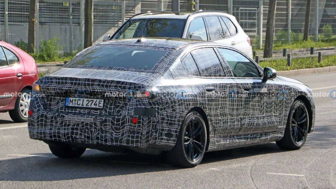 从侧后方看,整体线条显得非常圆润,这应该是出于风阻系数的考虑,要知道现款宝马5系风阻仅为0.22Cd,全新的宝马i5应该还会低于这个数字。新车的尾部似乎也没有采用时下流行的贯穿式尾灯,并且由于是纯电车型的缘故,排气筒自然也是没有的,相比燃油版车型虽然少了一丝运动感,但整体感会更强一些。