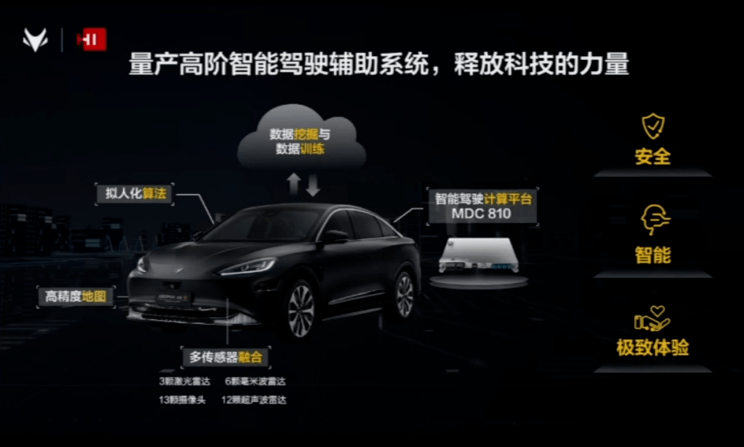 而整个车内变化最大的部分就隐藏在大屏的内部,新车搭载了华为MDC 810智驾计算平台,算力达400TOPS。如此强大的算力可以快速处理3颗激光雷达、6颗毫米波雷达、9颗ADS高清摄像和4颗环视摄像头收集到的信息,甚至还有大量冗余,这种冗余可以有效应对未来OTA升级开放的更多驾驶辅助功能。