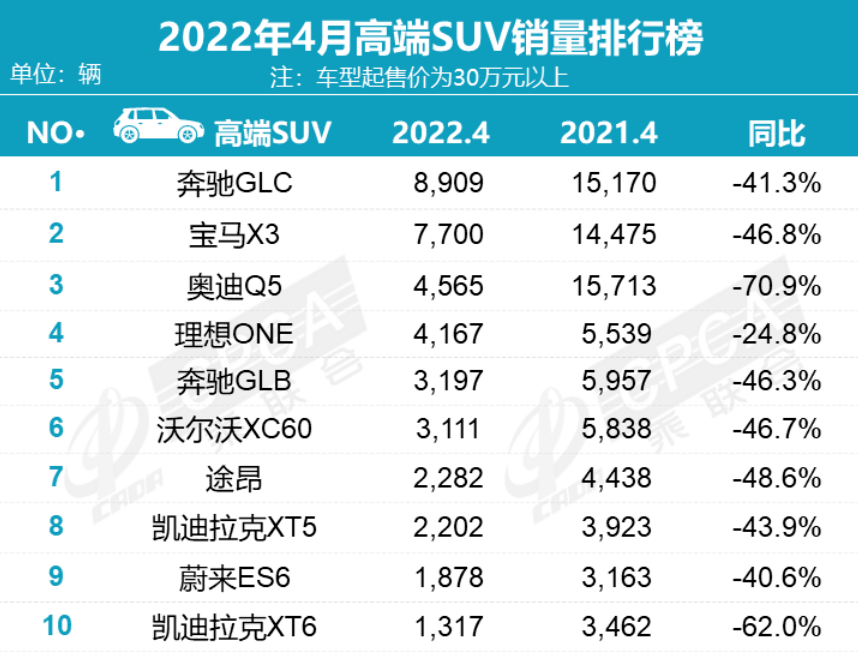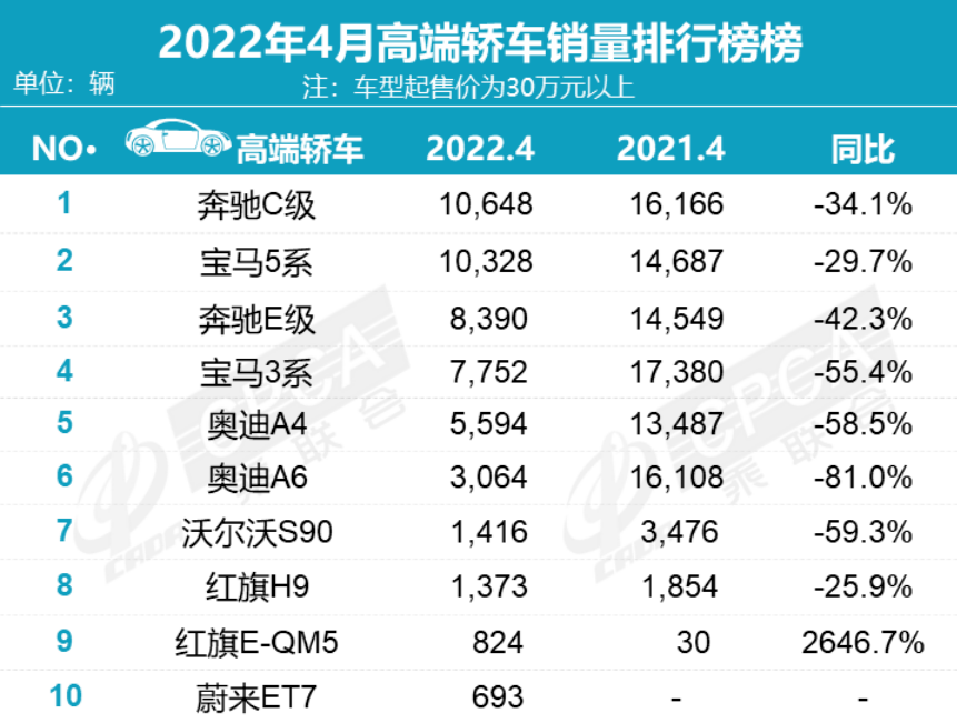 5月11日,乘联会公布了最新零售销量数据,4月份国内狭义乘用车市场销量达104.3万辆,同比下降35.5%,环比下降34.0%;1-4月份累计销量595.8万辆,同比下降11.9%。在国际局势动荡和上海疫情对供应链的双重打击下,汽车行业受到的冲击异常巨大。而在高端车市场中,虽然整体呈现下滑趋势,但依然有一些车型给我们带来了相对亮眼的数据,让我们先睹为快吧。