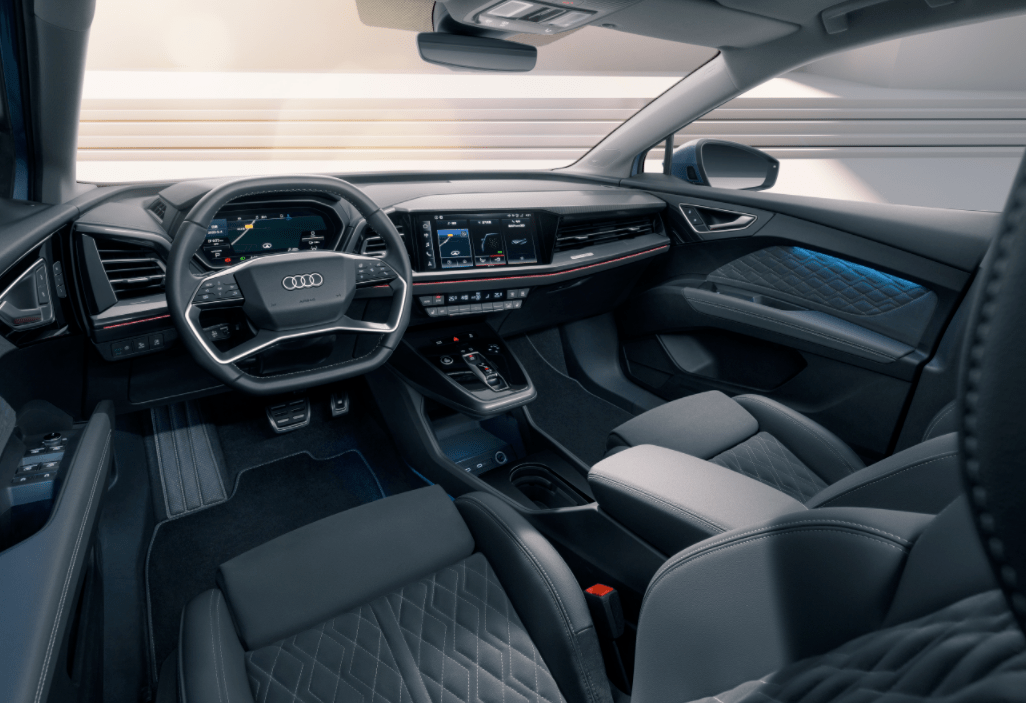 奥迪Q4 e-tron的内饰采用了一种叫作星舰座舱的设计,意在凸显出众的科技感。贯穿式出风口做出了不规则的图案,有几分像星际战舰的操作平台,中控屏明显偏向驾驶者一侧,似乎表明了这台车的内饰更想取悦驾驶者,这种氛围无疑是年轻人所喜爱的。