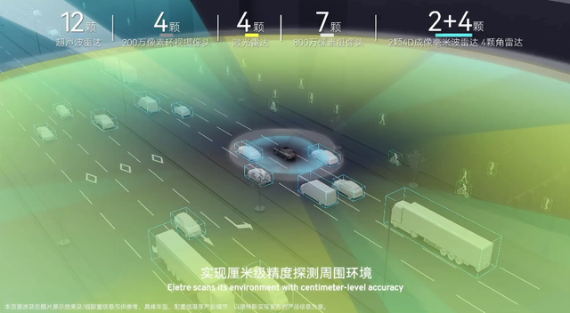 硬件方面,Eletre搭载了2颗高通骁龙8155车机芯片,2颗算力高达508 TOPS的英伟达7nm Orin芯片,以及34个传感器,其中包含12颗超声波雷达、4颗200万像素环视摄像头、4颗激光雷达、7颗800万像素摄像头以及2颗4D成像毫米波雷达+4颗角雷达。