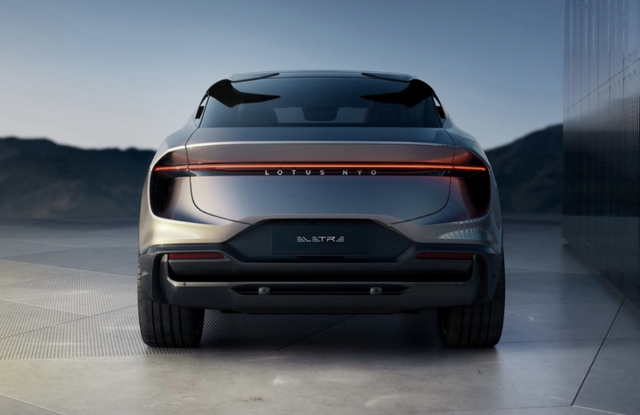 Eletre的尾部显得极度简约,几乎看不到任何多余的设计元素,但独特的线条与构造让Eletre能够充分利用光影关系来凸显车尾的层次感与立体感。在尾部中央,一条“一线式”贯穿尾灯恰到好处地起到了点缀作用,细看之下,会发现上面还有“LOTUS NYO”字符。再往下看,熏黑处理的扰流板其实内有乾坤,它能够在需要时主动为Eletre提供一定的下压力。