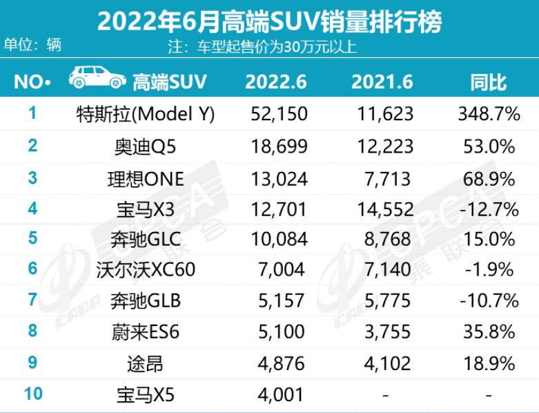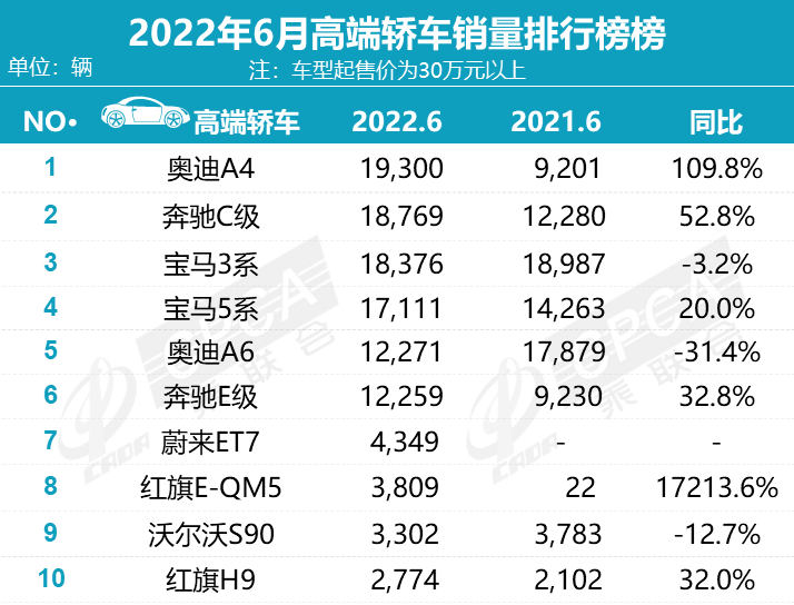日前,乘联会公布了最新零售销量数据,6月份国内狭义乘用车市场销量达194.4万辆,同比增长22.7%,环比增长43.5%;1-6月份累计销量926.1万辆,同比下降7.2%。而在高端车市场中,许多车型都实现了较大幅度同比增长,A4L则凭借超100%同比增长率夺冠,特斯拉Model Y更是卖出了超过5万辆,这个数据几乎是高端SUV销量榜2-5名销量总和,让我们先睹为快吧!