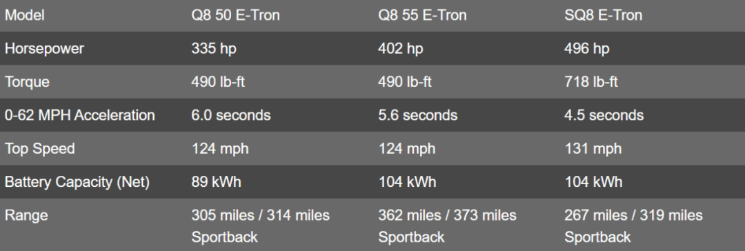 Q8 e-tron本次推出了三种动力,分别拥有250kW/300kW/370kW输出,零百加速成绩分别为6秒、5.6秒和4.5秒,续航里程则根据不同车型从267英里到373英里不等。换算过来的话,Q8 e-tron 55尾标车型的Sportback车型因为具备低至0.24的风阻系数,所以更严苛的WLTP标准下也具备了超600km的续航里程,这对一台104度电池双电机的高性能SUV来说并不容易。