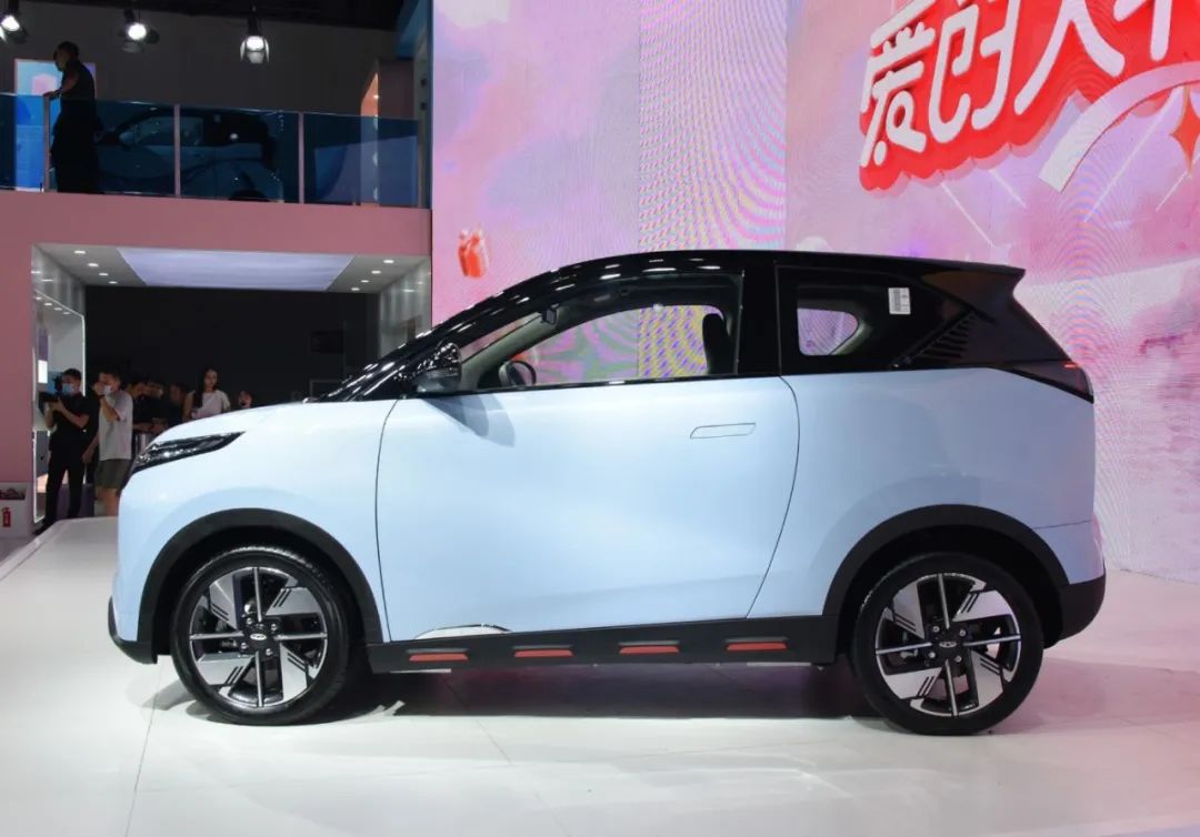 来到车身侧面,还有很多地方值得一说:在16英寸风暴战轮、隐藏一体式电动门把手加持下,让整车造型极具科幻感。双色车身、侧裙上的撞色装饰,辨识度也进一步提升。同时,新车长宽高分别为3402/1680/1550(1590)mm,轴距为2160mm,比宏光MINIEV轴距更长,空间表现更加值得期待。