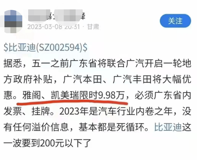 比亚迪开年官降算是掀开了价格战的序幕,加上雪铁龙助力,其他合资厂商似乎也在望风而动。其中就出现了“五一前广东省将联合广汽开启一轮地方补贴,雅阁、凯美瑞限时9.98万元”的说法。