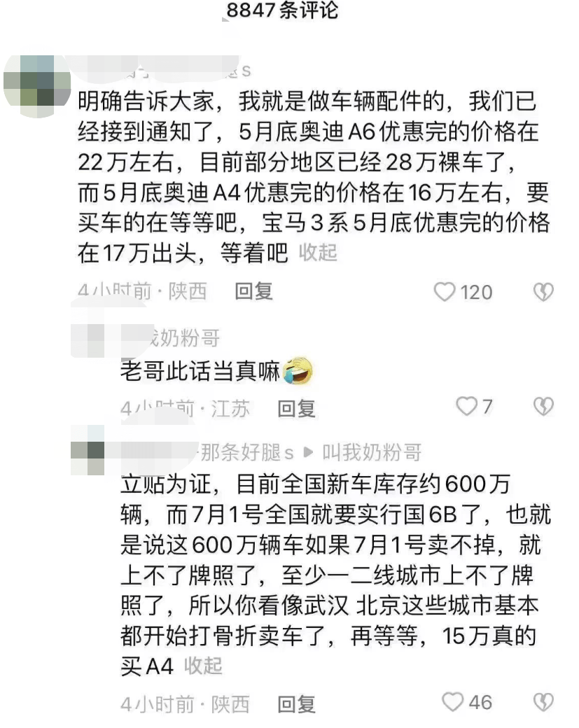既然提到合资,自然绕不开BBA。按照正常逻辑,合资暴跌,BBA是不是也得跟着降价?因此前几日上图所示的信息在各大群内都有传播,许多朋友还欢欣鼓舞道:人均BBA的时代要来了。22万元的A6L、17万元的宝马3系,想想确实很诱人。但首先国6B这个说法显然站不住脚,奥迪早在2019年就全面推行国6B了,所以显然排放原因无法支持它的论点。