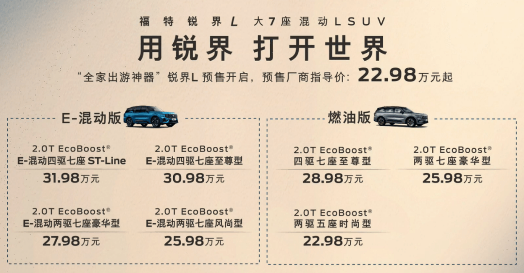 3月17日,福特锐界L开启预售,预售价22.98-31.98万元,共7款车型,燃油版3款,混动版4款。值得一提的是混动系统的发动机输出甚至超过了全新宝马7系的3.0T低功率发动机,并且百公里油耗也低至6.31L。