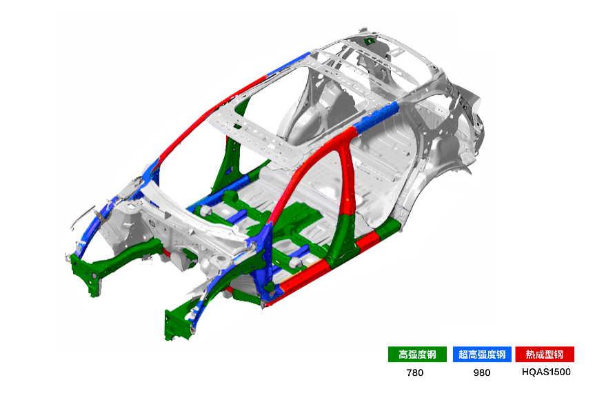 而在车身设计方面,全新一代皓影整车车身骨架有50%以上采用高强度钢。给大家分享一组数据:该车在A柱、B柱、车底边梁等重要关键部位,采用了1500MPa热成型材料来加强车身刚性。同时,在车底内边梁、车顶边梁、前围支柱、地板纵梁等地方也采用了抗拉强度980MPa以上的超高强度钢板。细品一下,你会发现,全新一代皓影并不是盲目的“堆料”,通过科学地排列分布,把“好刚用在刀刃上”,为消费者构建了一个高刚性、轻量化车身。