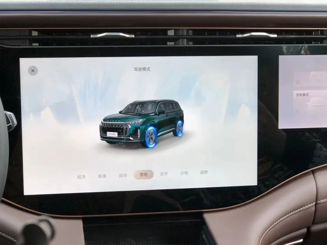 此次试驾,我们驾乘一款顶配车型,拥有经济、标准、运动、雪地、泥泞、沙地、越野等7种驾驶模式。而对于一般家庭来说经济、标准模式足矣。偶尔自驾越野或行驶在比较恶劣的路况时,多种模式加上全场景智控四驱系统,进一步提升非铺装路面的行驶能力。