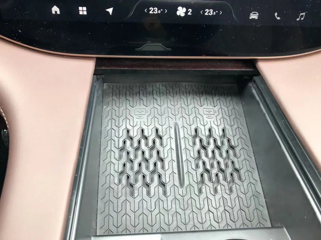 智能化方面,该车的科技感非常丰富,比如前排双手机50W无线充电功能,同时满足两部手机无线充电。