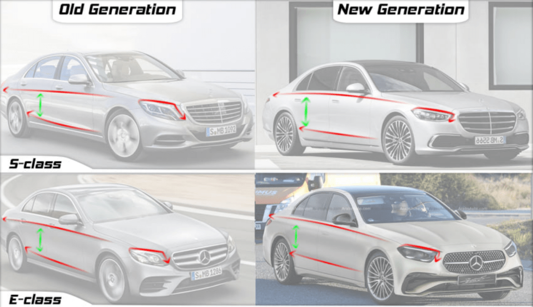 除了大灯,车辆的腰线比例也有明显变化,新一代车型的上下腰线趋向平行,这能降低车侧的视觉重心,相比老款少了一丝优雅,多了一分运动。标准的短前悬长后悬设计也是前置后驱油车时代的经典,隐藏式门把手应该算是奔驰在燃油车上的一大突破。
