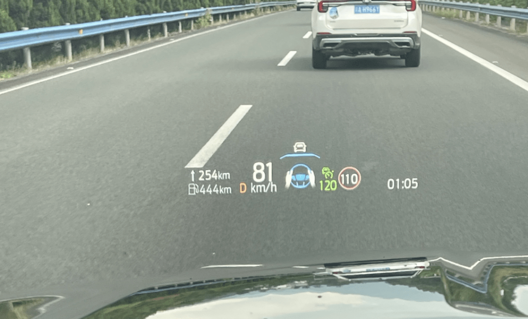 当我们打开驾驶辅助,并开启座椅通风和按摩,便可以轻松享受安静平稳的驾乘氛围,这才是最佳的旅行状态。但这一大票舒适、科技配置中,圈哥印象最深的还是这套HUD抬头显示系统,无论是隧道还是艳阳高照路况下,它都能清晰显示丰富的行车数据以及导航信息,全程不用低头看仪表真的太爽了。