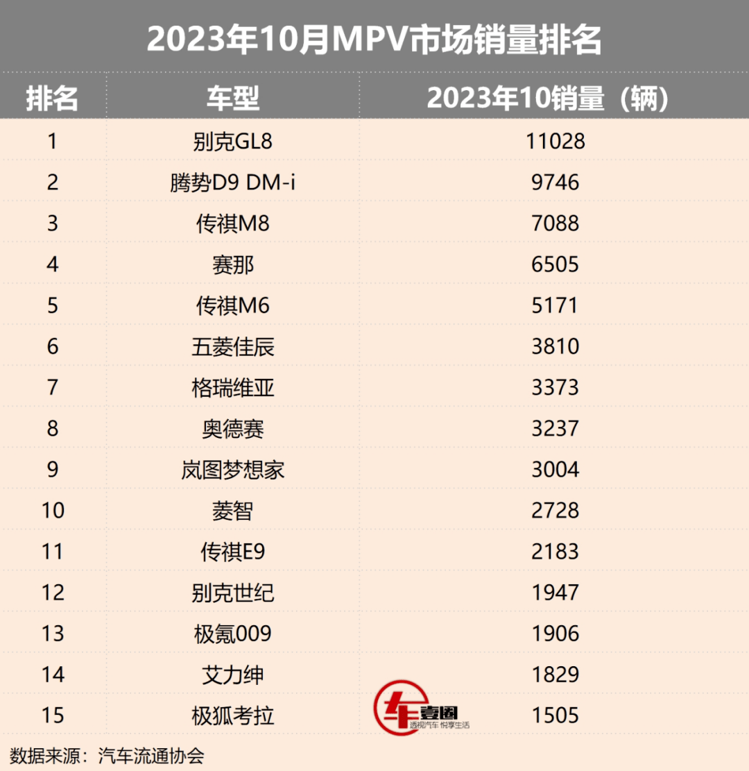 日前,《车壹圈》从乘联会获取了10月份最新销量数据,10月份国内狭义乘用车市场零售销量达203.3万辆,同比增长10.2%。其中,MPV销量9.3万辆,同比上升13.1%,市场复苏明显。随着消费者对于汽车的需求日益多元化,MPV车型在市场中扮演着越来越重要的角色,本期《车壹圈》将带您深入剖析前15名中的亮点车型,解读其背后的市场秘密。