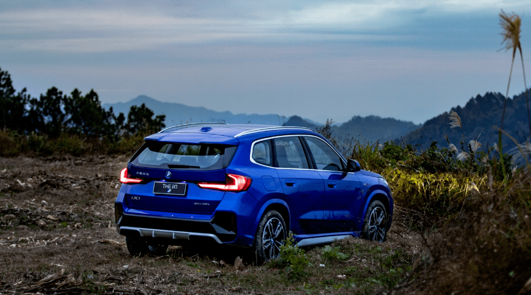 从侧面看,全新宝马iX1经过轴距加长后,车长达到了4616mm,因此并不存在紧凑级SUV所谓的“紧凑感”,2802mm的轴距实际上也达到了中型SUV的标准,这使得车身姿态更加舒展。车尾造型独特的C型尾灯,辨识度颇高,也营造出了强烈的视觉冲击力,与苗寨的自然景观形成了鲜明的对比。