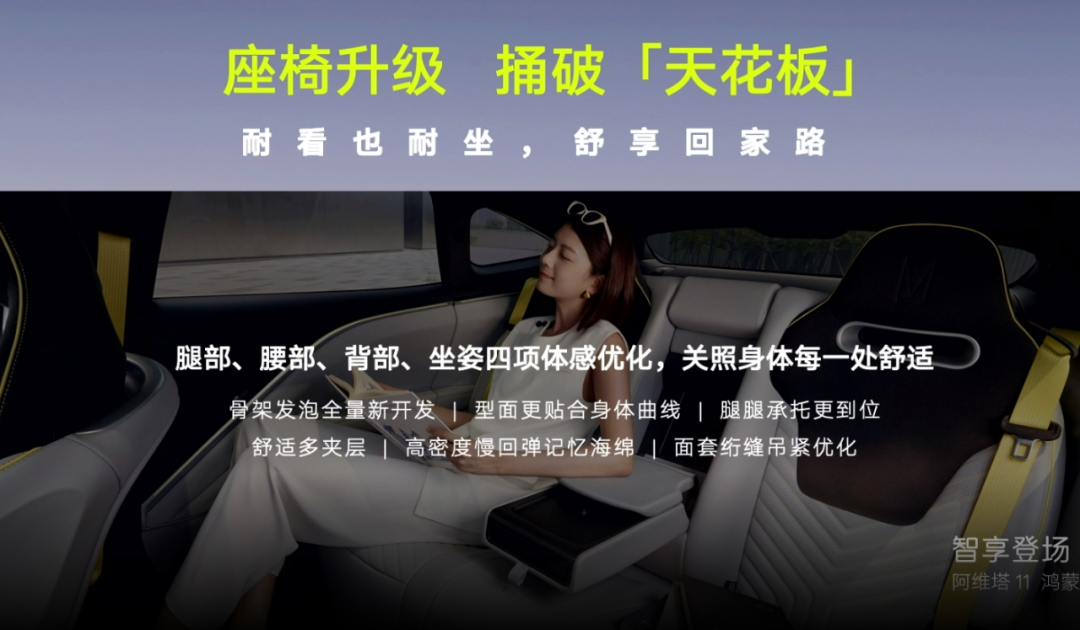 座椅舒适性方面,新款阿维塔11对座椅支撑和坐姿进行了四项体感优化设计。通过优化座椅腿部、腰部、背部和坐姿,包括调整座椅骨架和发泡面软硬使其更贴合中国人身形,为用户提供更加舒适、自然的乘坐体验。