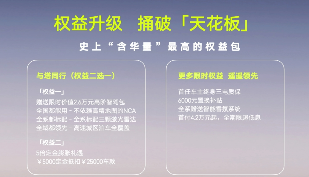 在购车权益方面,阿维塔11鸿蒙版智享升级款再次捅破了天花板。首先,用户可享受赠送限时价值2.6万的高阶智驾包,而同行多数是订阅制或3万元以上买断制。此外,购车用户还可选择享受5倍定金膨胀的优惠,即下定5千可抵扣2.5万,这一政策实际已经把新车的入门价拉到了28万元。不过需要注意的是权益是限时的,且是智驾包和定金膨胀二选一。同时,首任车主还可享受终身三电质保、6千置换补贴以及智能香氛等其他“小”一些的权益,确实厚道。