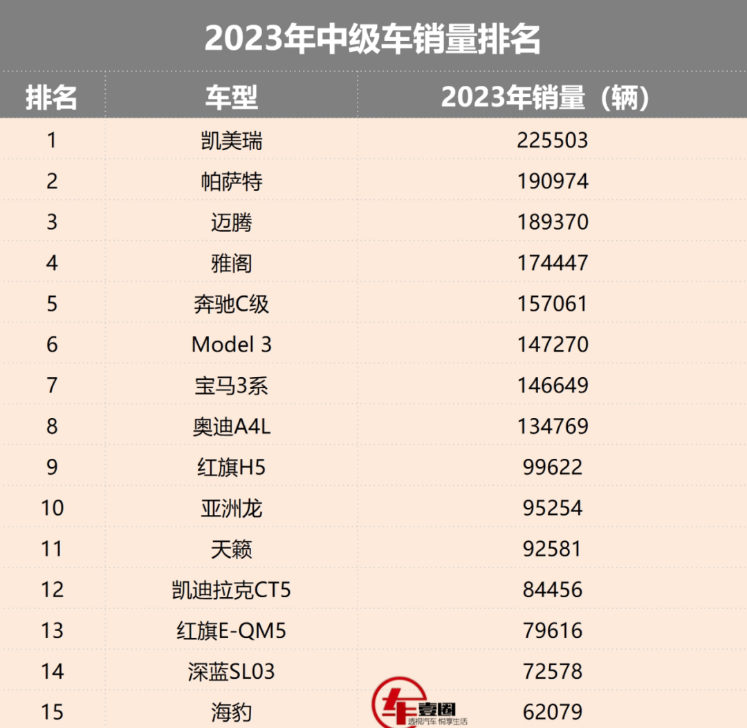 所以接下来,《车壹圈》将对2023年中级车销量进行解析,探讨各车型的排名情况,分析当前市场态势,并对2024年中级车市场做出预测和总结。