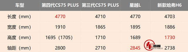 除此之外,新车尺寸也有明显变化,新车长宽高分别为4770/1910/1695(1705)毫米,轴距达到了2800毫米,相比第三代车型的轴距足足长了90毫米,也带来了更加出众的后排空间表现。对比同级竞品来说,第四代CS75 PLUS尺寸优势明显,只是比星越L轴距稍短一些,结合长安以往的空间优化水平,圈哥相信新车实际内部空间表现肯定是非常充裕的。